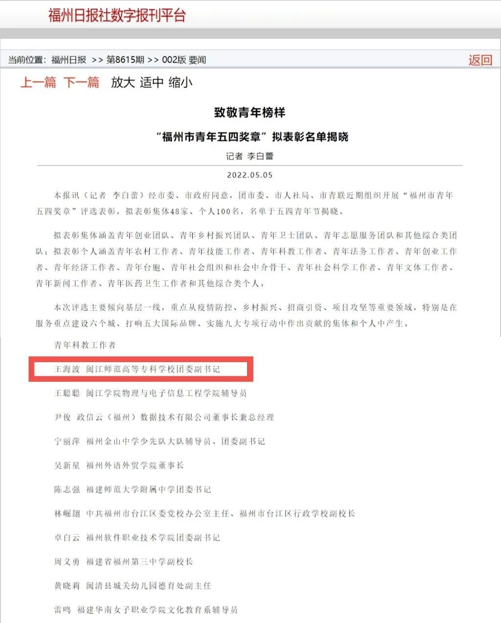 日前,大赢家体育app下载团委副书记王海波获评“福州市青年五四奖章”。