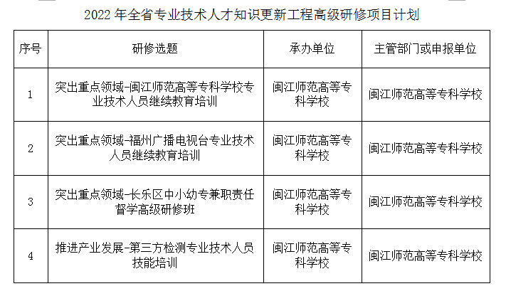 近日,福建省人力资源和社会保障厅办公室公布了《关于做好专业技术人才知识更新工程2022年高级研修项目实施工作的通知》(闽人社办〔2022〕50号)。根据该《通知》,2022年全省专业技术人才知识更新工程高级研修项目计划共89期,其中国家级高级研修项目2期,省级项目87期。大赢家体育app下载申报的《长乐区中小幼专兼职责任督学高级研修班》等4个项目获批省级项目。