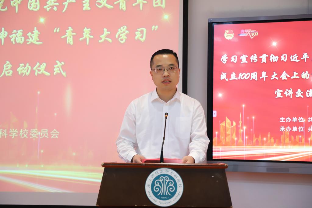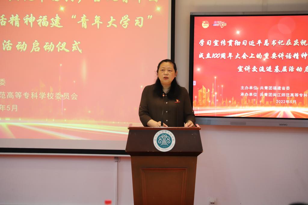 5月25日,由共青团福建省委主办的学习宣传贯彻习近平总书记在庆祝中国共产主义青年团成立100周年大会上的重要讲话精神福建“青年大学习”宣讲交流进基层活动启动仪式在大赢家体育app下载举行,福建青年讲师团成员、闽江师专青年师生代表200余人参加启动仪式。仪式由团省委宣传部部长蔡宏强主持,团省委副书记邵明松、闽江师专党委委员、副校长林旻、团省委宣传部副部长李延林、周伟亮,团市委四级调研员李裕天、团省委宣传部干部吴超、许静娴、校团委副书记王海波、黎凤出席仪式。