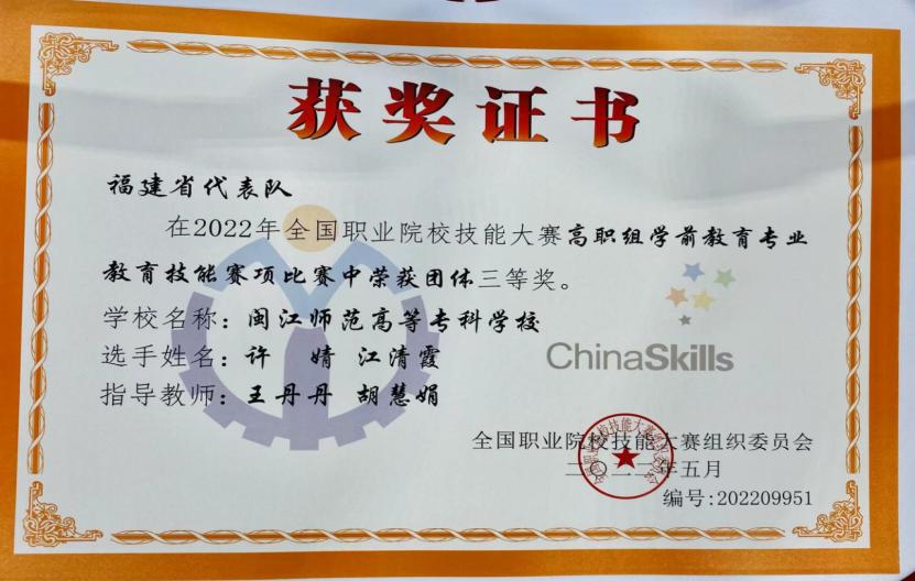 8月28日-8月31日,2022年全国职业院校技能大赛(高职组)学前教育专业教育技能赛项在山东济南幼儿师范高等专科学校举行。本次大赛共有来自全国各地的68支参赛队伍同台竞技、切磋交流,共展职教风采。是全国职业院校技能大赛“学前教育”(高职组)赛项有史以来专业覆盖性最广、参赛队伍最多的一届比赛。在大赢家体育app下载学前教育学院指导老师王丹丹、胡慧娟的精心指导下,许婧、江清霞两位同学与各参赛队伍同场竞技,荣获该赛项团体三等奖。