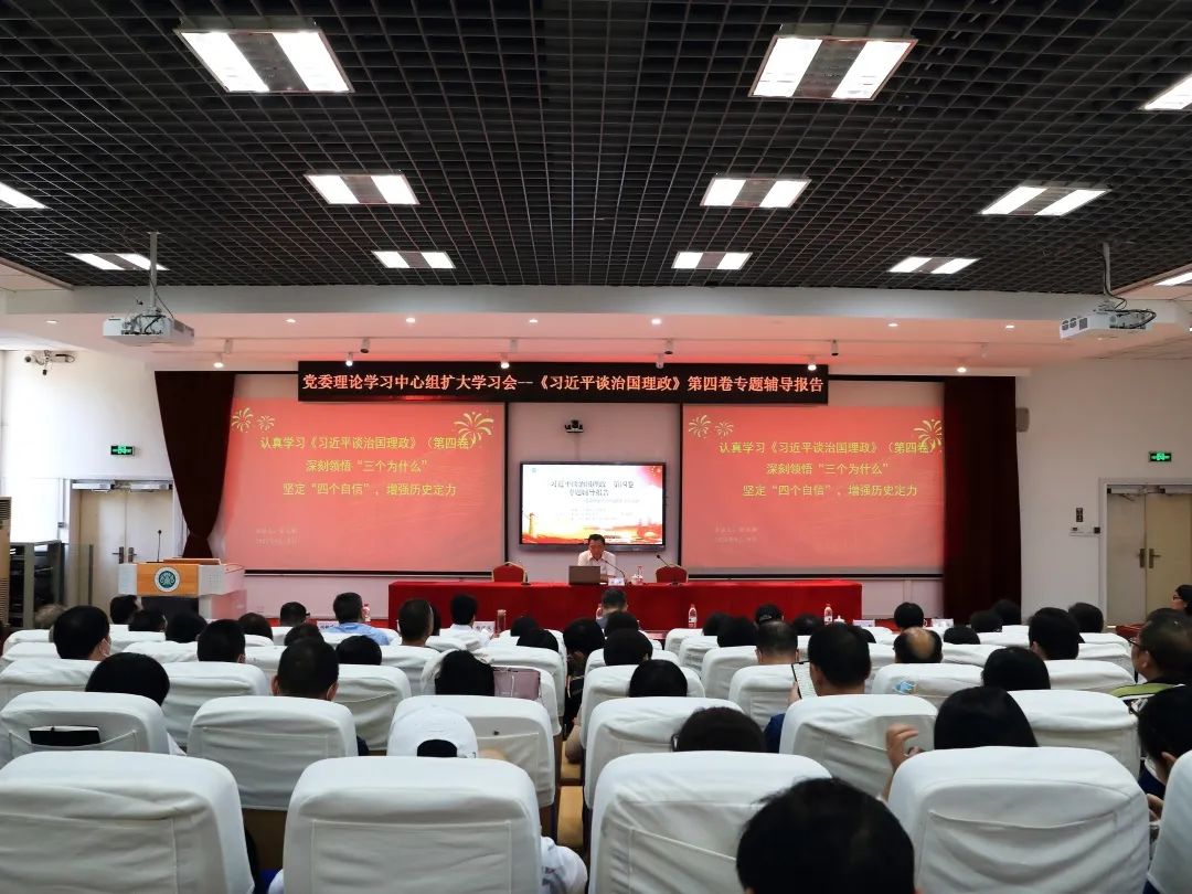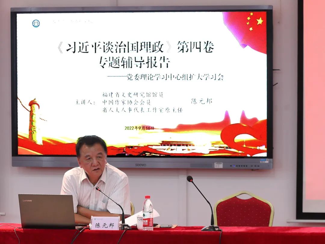 9月16日,校党委举行理论学习中心组(扩大)学习专题辅导报告会。 省文史研究馆馆员、中国作家协会会员陈元邦应邀作“认真学习《习近平谈治国理政》第四卷,深刻领悟‘三个为什么’,坚定‘四个自信’,增强历史定力”专题辅导。报告会由党委书记陈荣生主持。全体校领导、中层干部、党外教师代表参加报告会。