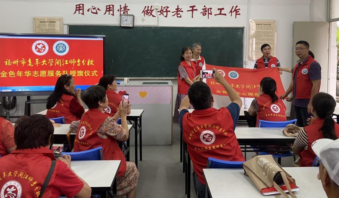 黄耀荣宣读成立福州市老年大学闽江师专分校金色年华志愿服务队的决定,并为志愿服务队授予“福州市老年大学闽江师专分校金色年华志愿服务队”旗帜,队长、副队长上台接受队旗。