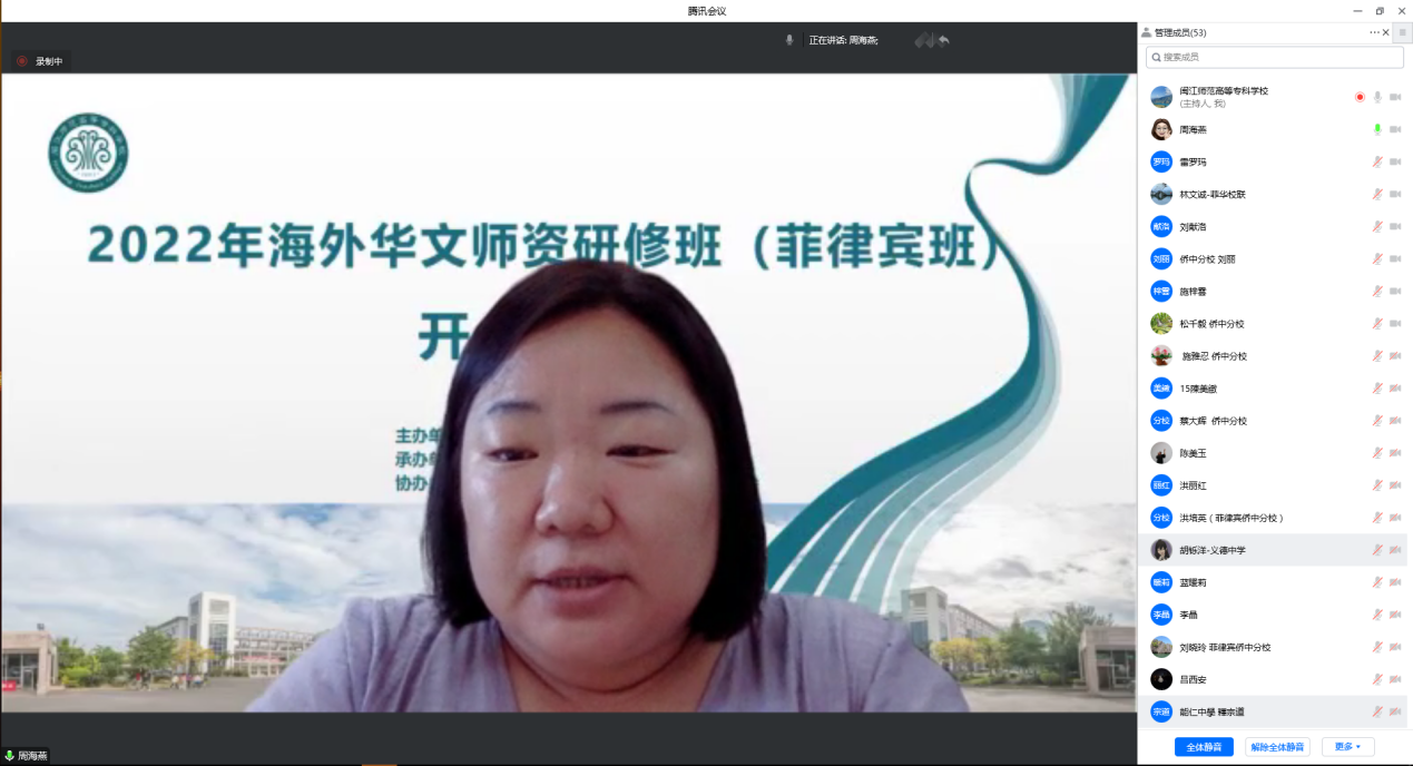 在海外华文教师代表发言环节中,来自菲律宾班的学员代表周海燕表示,此次培训安排课程内容丰富,设计精心,我们能得到这么优秀学校的培训,深感荣幸。相信我们各位老师都会在本次师资培训中受益良多,并将此次学到的知识运用到自己的实际教学当中去。