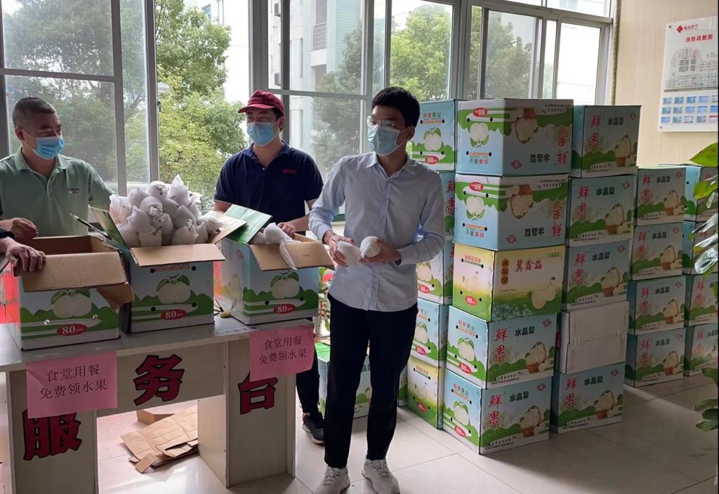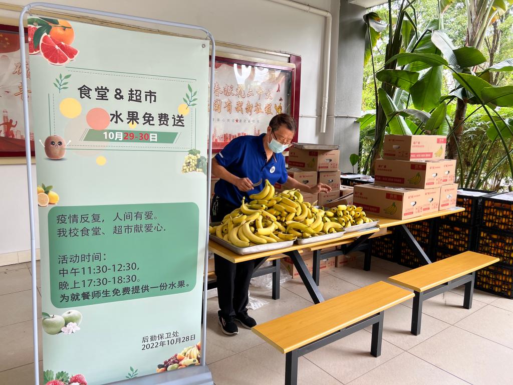 送爱心水果活动。食堂、超市备足食品,除提供丰富菜品和食物外,还开展免费为就餐师生送爱心水果和姜茶活动,温情满满。