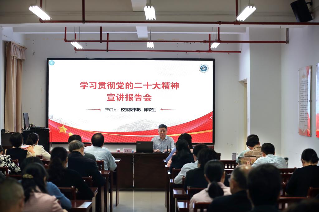 11月23日,校党委书记陈荣生在党员活动室作学习贯彻党的二十大精神宣讲报告,开展“书记第一讲”。校领导、各二级党组织书记、各部门、学院、单位负责人聆听了宣讲。报告会由副校长谢敏峰主持。
