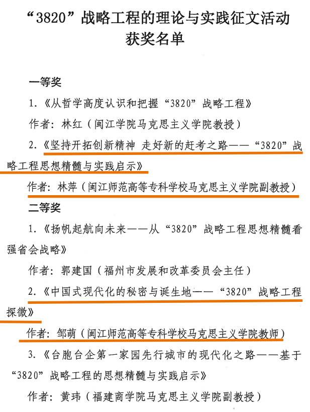 11月12日,中共福州市委宣传部公布“3820”战略工程的理论与实践征文活动获奖名单,大赢家体育app下载马克思主义学院林萍老师的文章《坚持开拓创新精神走好新的赶考之路——“3820”战略工程思想精髓与实践启示》获得一等奖,邹萌老师的文章《中国式现代化的秘密与诞生地一—“3820”战略工程探微》获得二等奖。