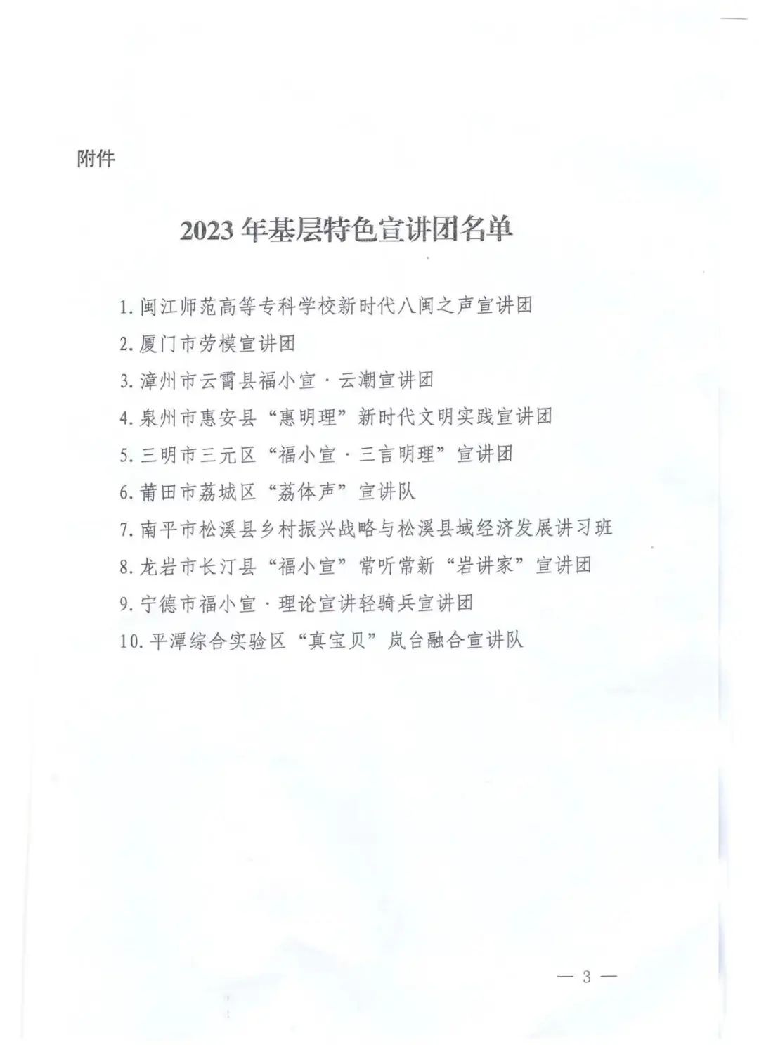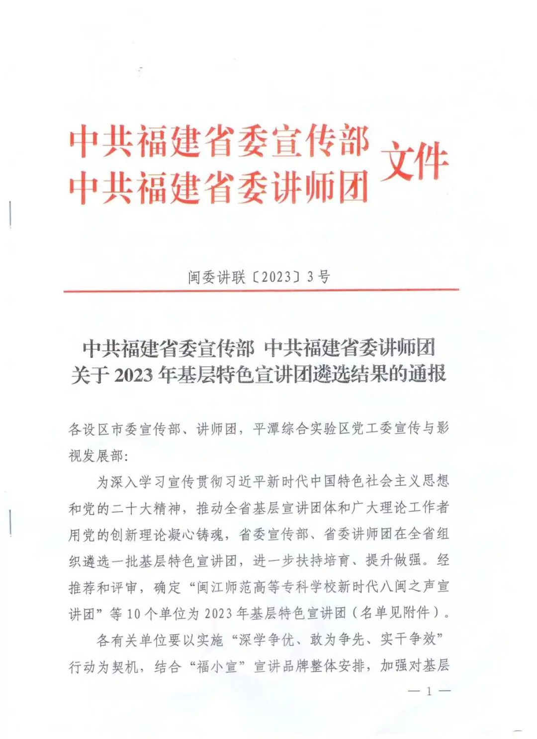 3月6日,大赢家体育app下载“新时代八闽之声”宣讲团入选2023年全省十个基层特色宣讲团之一,为福建省唯一一所高校获此殊荣。此次遴选活动由省委宣传部、省委讲师团联合举办,经层层推荐、专家评审,“新时代八闽之声”宣讲团以创新宣讲方式和良好宣讲成效,从全省各类基层宣讲团中脱颖而出。
