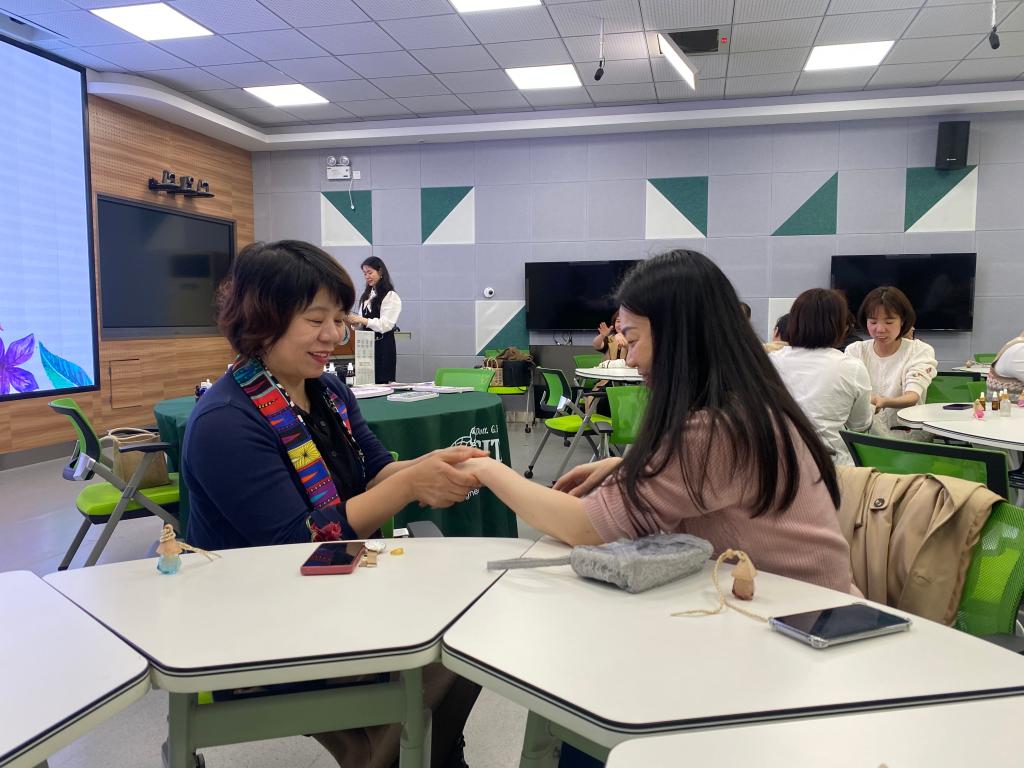 “喧嚣中,需要一缕香气,让我们放慢灵魂的脚步......”4月12日下午,在旗山校区3016教室内,芬芳四溢,沁人心脾,福州市工人文化宫特聘教师刘建芳为学校女教职工带来一堂“芬芳女神”植物精油调香体验课堂,40多名女教职工参与课堂。