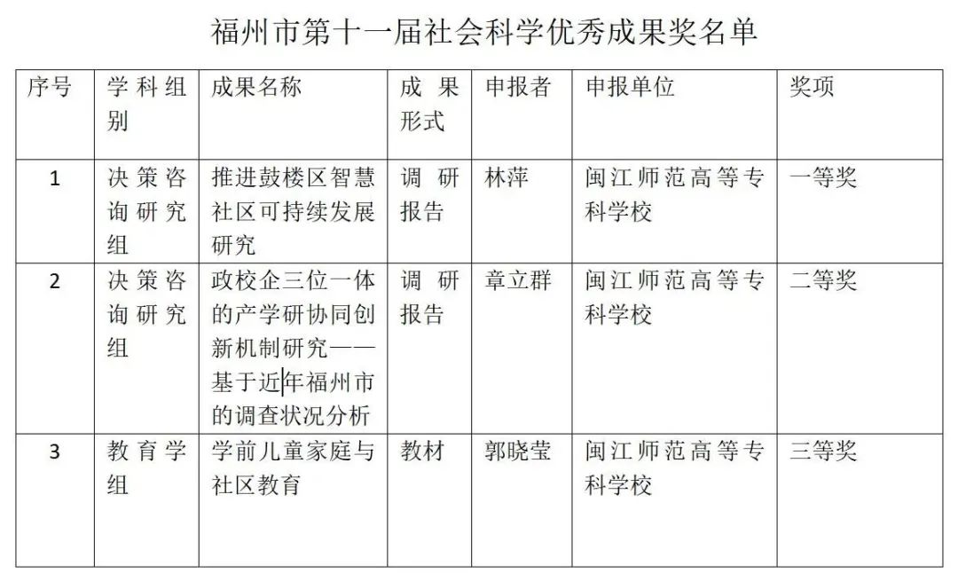 由马克思主义学院林萍老师撰写的调研报告《推进鼓楼区智慧社区可持续发展研究》获一等奖,科研处章立群老师撰写的论文《政校企三位一体的产学研协同创新机制研究——基于近年福州市的调查状况分析》获二等奖,科研处郭晓莹老师编写的教材《学前儿童家庭与社区教育》获三等奖。