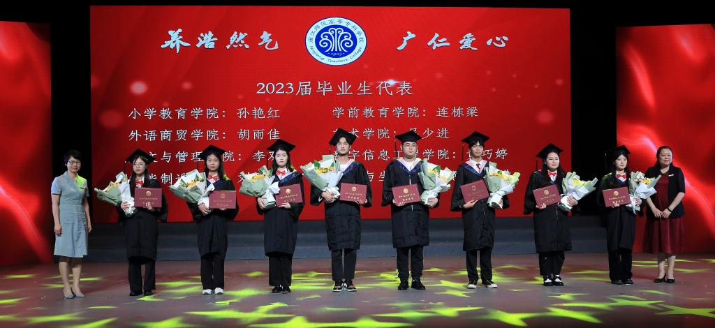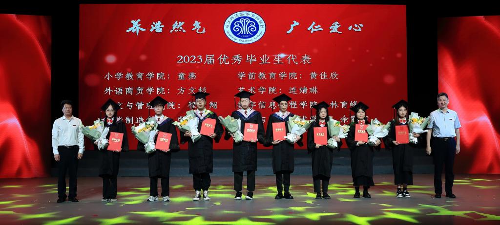 数字信息工程学院黄巧婷同学作为毕业生代表发言,小学教育学院邹明忠博士作为教师代表发言,向同学们送去临别赠言。毕业生代表感谢老师们的倾囊相授,感谢楼管阿姨让大家“寓”见幸福,感谢食堂师傅的暖心守“胃”,感谢医护人员在三年“战疫”中,以凡人之躯,做超人之事,守护大家的健康,并为他们献上了鲜花。校友会黄耀荣会长为2023届各学院校友召集人代表颁发聘书。