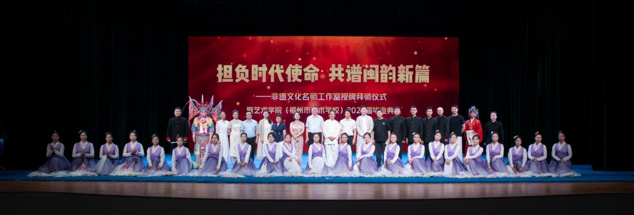为学习宣传贯彻党的二十大精神和习近平总书记在文化传承发展座谈会上的重要讲话精神,担负非遗传承使命,充分发挥名师示范、引领和辐射作用,全面展示优秀传统文化闽剧艺术传承发展硕果,6月21日,艺术学院(福州市艺术学校)在艺术实训剧场隆重举行非遗文化传承名师工作室授牌拜师仪式暨艺术学院(福州市艺术学校)2023届毕业典礼。校党委书记陈荣生、校长杨建义,表演艺术(二元制)联合办学单位负责人,福建省闽剧艺术发展联盟成员单位负责人,艺术学院党政联席会议班子成员、全体教师、2023届毕业生及家长出席仪式,共同见证这一重要时刻。
