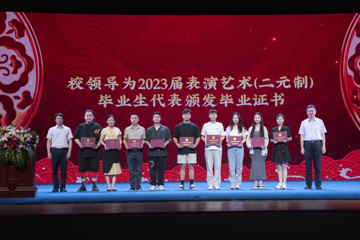 在毕业典礼环节,艺术学院院长徐青《宣读了福州市艺术学校关于准予2023届学生毕业的决定》。校党委书记陈荣生、校长杨建义为表演艺术(二元制)毕业生代表颁发毕业证书。艺术学院领导为福州市艺术学校2023届毕业生代表颁发毕业证书。