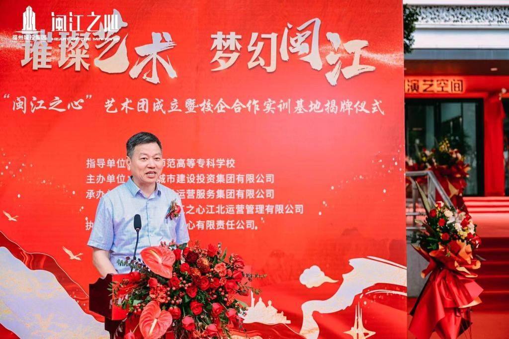 在致辞中,陈荣生书记对“闽江之心”艺术团成立和校企合作实训基地签约致以祝贺,并向关心和支持福州职业教育、闽江师专发展的各界人士表示衷心感谢!他介绍,近年来,在福州市委、市政府的正确领导下,学校在举办大型演出活动上积累了丰富的经验,如创排闽剧《红裙记》献礼新中国成立70周年,压轴献演第十六届中国戏剧节,荣获优秀剧目奖;参演第四十四届世界遗产大会的开幕式、闭幕式,创排了2023年度福建省文艺发展专项基金扶持项目《奔腾向海》情景歌舞剧等,获得广泛赞誉。他表示,希望以此次共建校企合作实训基地为契机,积极发挥各自优势和特色,共同讲好福州故事,推动福州文化内涵与福州城市品质交相辉映,打造出福州响亮的文旅、教育金名片。同时,共同探索产业链、创新链、教育链的有效衔接机制,为文旅市场培养更多优秀人才,为福州乃至福建的文旅产业繁荣与发展提供有力的人才支撑。