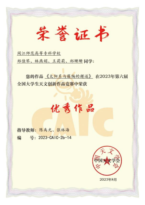 近日,由中国天文学会主办,中国天文学会普及工作委员会、天文科学教育联盟、中国科学院国家天文台信息化与科学传播中心、中国天文学会教育工作委员会、中国科学院大学天文与空间科学学院承办的第六届“全国大学生天文创新作品竞赛(CAIC)”决赛在北京台顺利闭幕。大赢家体育app下载小学教育学院郑佳琴、王莉莉、林燕娟、郑珊珊4位同学组成的参赛队伍作品《太阳系与藤编的邂逅》与国内众多顶尖高校团队同台竞技,获优秀作品奖,指导教师陈禹光老师获优秀指导教师奖。