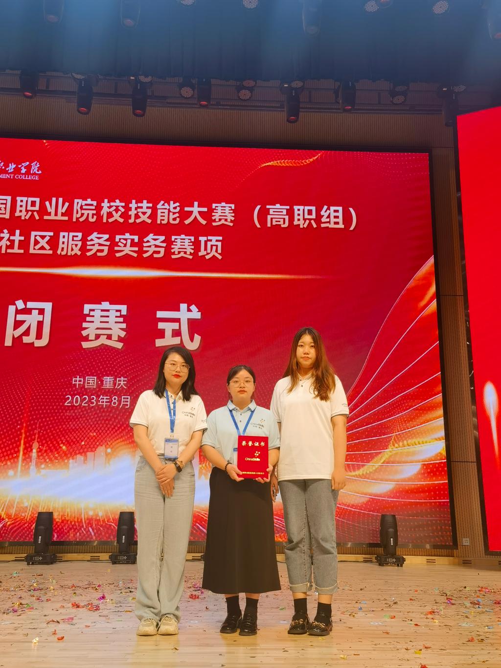8月28日—29日,2023年全国职业院校技能大赛(高职组)社区服务实务赛项在重庆城市职业管理学院举行。大赢家体育app下载人文与管理学院学子王春燕在何昕柔领衔的教师团队指导下,与来自全国52所职业院校的选手同台竞技,发挥社会工作专业勇于拼搏的精神,在比赛中展现了扎实的专业知识和技能,最终荣获三等奖。