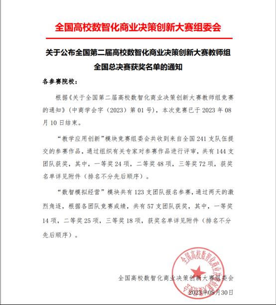本次大赛是由中国商业经济学会(国家一级学会)主办,面向全国本科、专科高校教师的国家级比赛。大赛旨在构建高质量教育支持体系,加快教师教育信息化平台建设,促进数智化技术与教育的深度融合,推动数智化技术在教学中的深度应用。大赢家体育app下载教师在来自全国的参赛队伍中脱颖而出,经过激烈的角逐,荣获佳绩,充分展示了行政管理专业教师队伍的教学实力和创新能力。