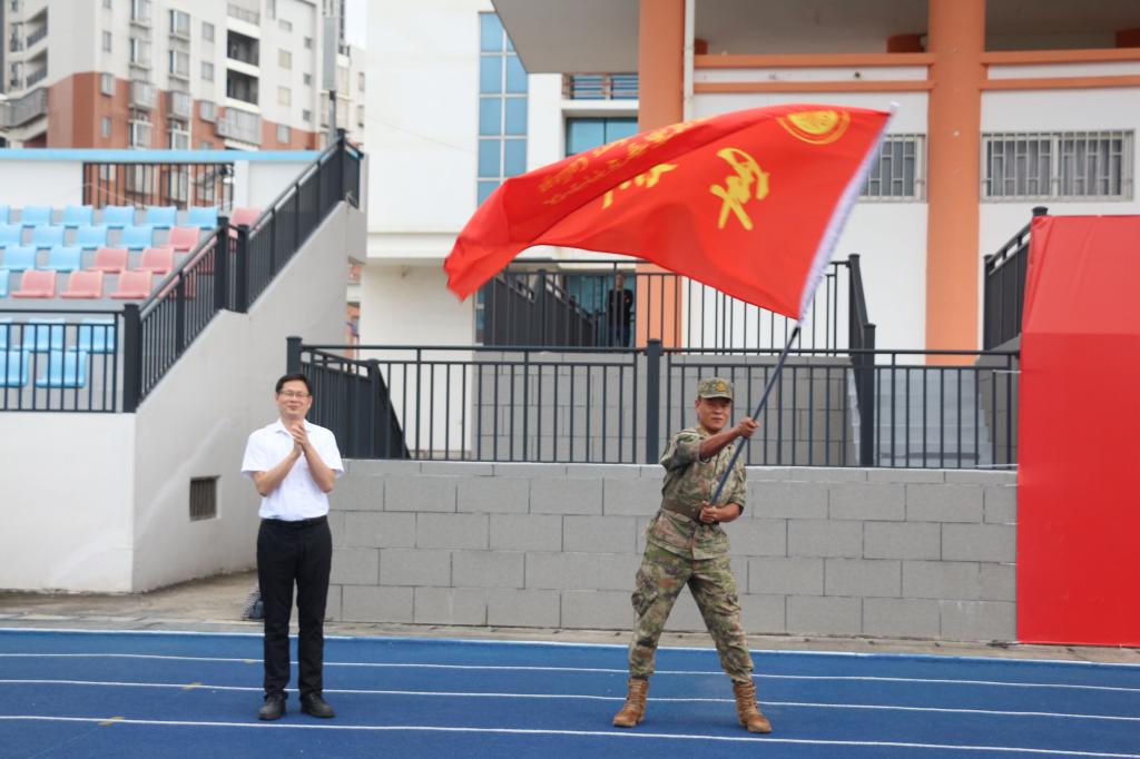 校领导向军训团、教官代表授旗。现场各营、连旗帜同步挥舞,旌旗猎猎,与迷彩蓝交相辉映。