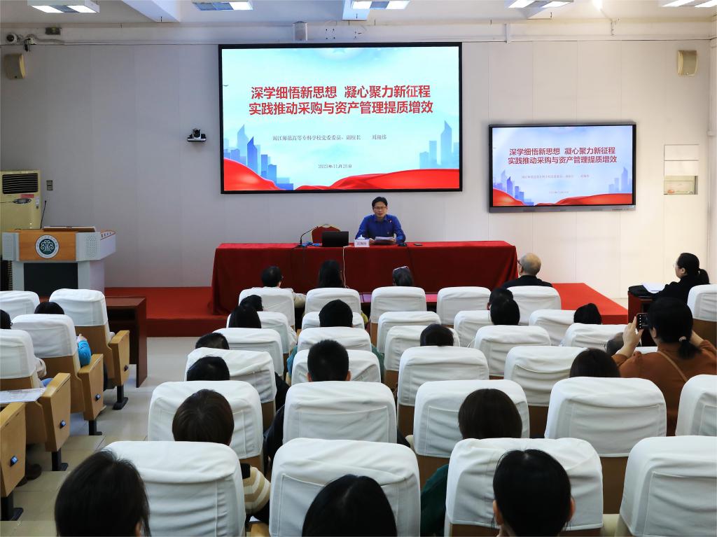 校党委委员、副校长刘翔炜以《深学细悟新思想凝心聚力新征程 实践推动采购与资产管理工作提质增效》为主题,详细阐述了大赢家体育app下载在采购与资产管理工作方面的现状与差距,针对采购项目预算测算、采购需求论证、履约验收、预算执行率等四个方面存在的具体问题,结合学校高质量发展提出进一步的优化方案。