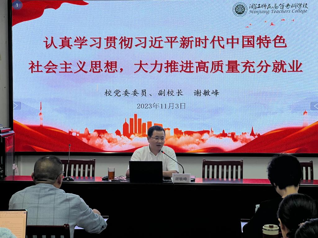 校党委委员、副校长谢敏峰以《认真学习贯彻习近平新时代中国特色社会主义思想,大力推进高质量充分就业》为主题,深入学习领会习近平总书记关于就业工作的重要论述精神,通过“高质量充分就业的内涵”“就业领域面临的挑战和困难”“存在的问题”“解决途径”等四个方面,为切实把高质量充分就业作为人口高质量发展的重要基础,推进大赢家体育app下载毕业生高质量充分就业作了详细阐述。