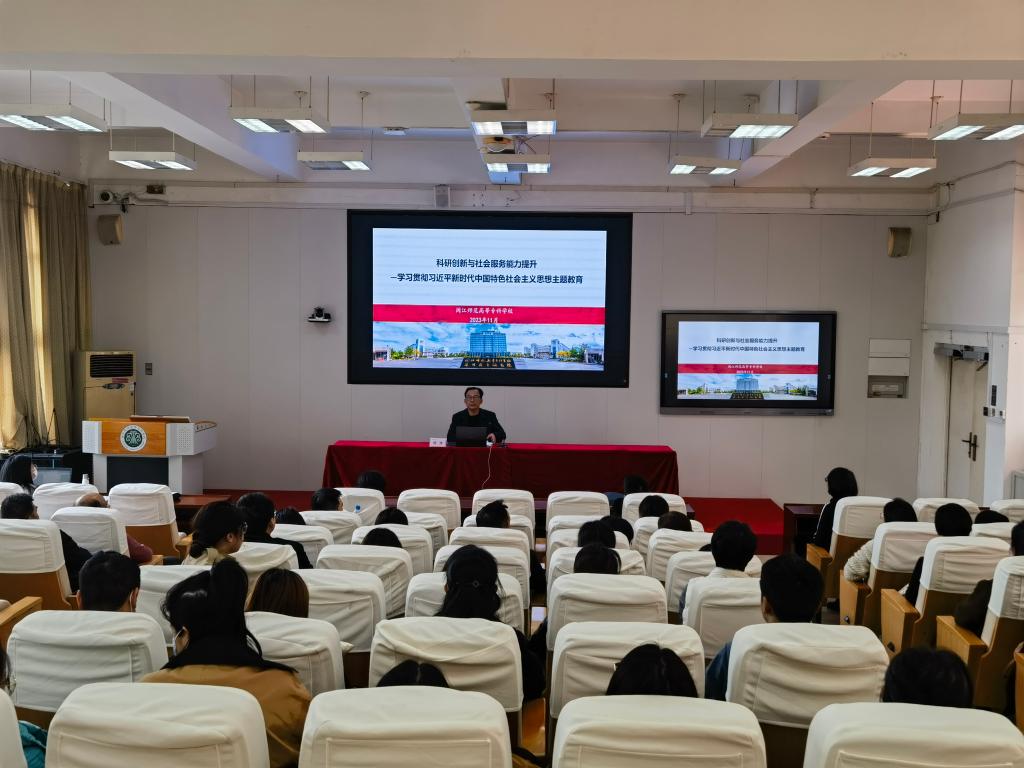 校党委委员、副校长陈强以《科研创新与社会服务能力提升——学习贯彻习近平新时代中国特色社会主义思想主题教育》为主题,深入学习贯彻习近平总书记关于科技创新的重要论述,围绕如何提升学校在科研创新、社会服务等方面的水平,推动学校高质量发展作了详细阐述。