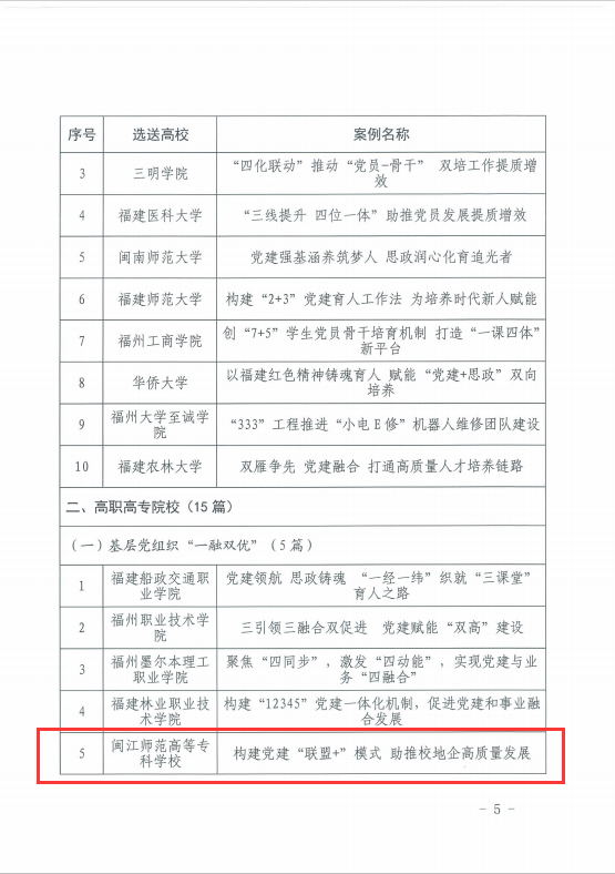 据悉,此次共遴选产生了46个全省高校“一融双优”基层党建工作模式典型案例,全省高职高专院校有15个项目入选,其中基层党组织“一融双优”案例5个。