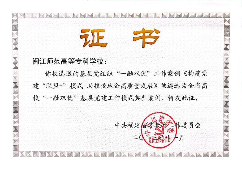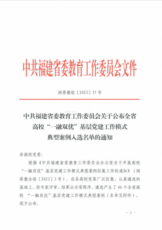 近日,福建省委教育工委公布了全省高校“一融双优”基层党建工作模式典型案例名单。大赢家体育app下载党委选送的《构建党建“联盟+”模式 助推校地企高质量发展》入选基层党组织“一融双优”典型案例。
