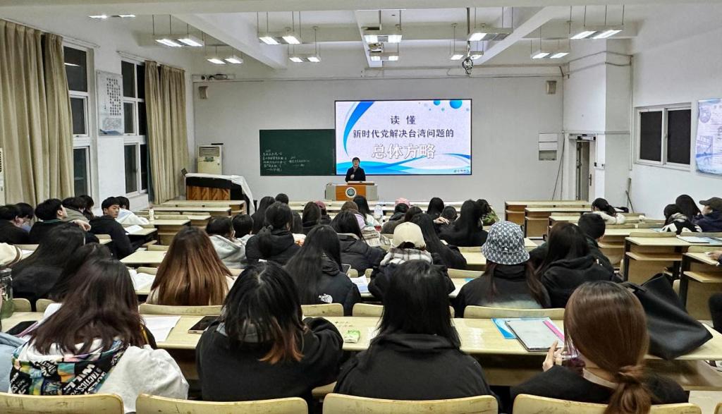 江柳青以“台湾问题”为切入点,引导学生思考为何台湾是中国不可分割的一部分,祖国必须统一也必然统一。她深入浅出地阐释了新时代解决台湾问题总体方略的理论来源、生动内涵和实践要求,引导学生深入理解新时代党解决台湾问题的总体方略是习近平新时代中国特色社会主义思想的重要组成部分,是党中央治国理政思想在对台工作领域的集中体现,是中国共产党人解决台湾问题、实现祖国统一的最新理论成果。课上,江柳青希望体同学们要厚植家国情怀,学好专业技能,发挥专业特长,努力做推动两岸关系和平发展、推进祖国和平统一进程的坚定支持者、参与者、奋斗者。
