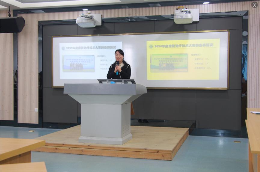 此赛项共获得福建省团体三等奖1项,康复治疗技术教研室主任李丽华作为培训团队教师代表结合康复治疗技术大赛情况,从备赛情况、参赛情况、备战情况下进行简要汇报。通过此次技能竞赛的初体验,她表示在今后的教学中将查缺补漏、积淀方法、不断历练,促成学生的专业成长,为学院贡献自己的微薄之力。