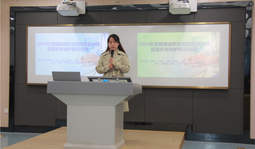 此赛项共获得福建省一等奖1项、三等奖1项。叶玉平对健康养老照护赛项进行总结经验。她从比赛情况、存在的问题与差距出发,总结经验,认清不足,对下一届竞赛有了更清晰的目标与规划。