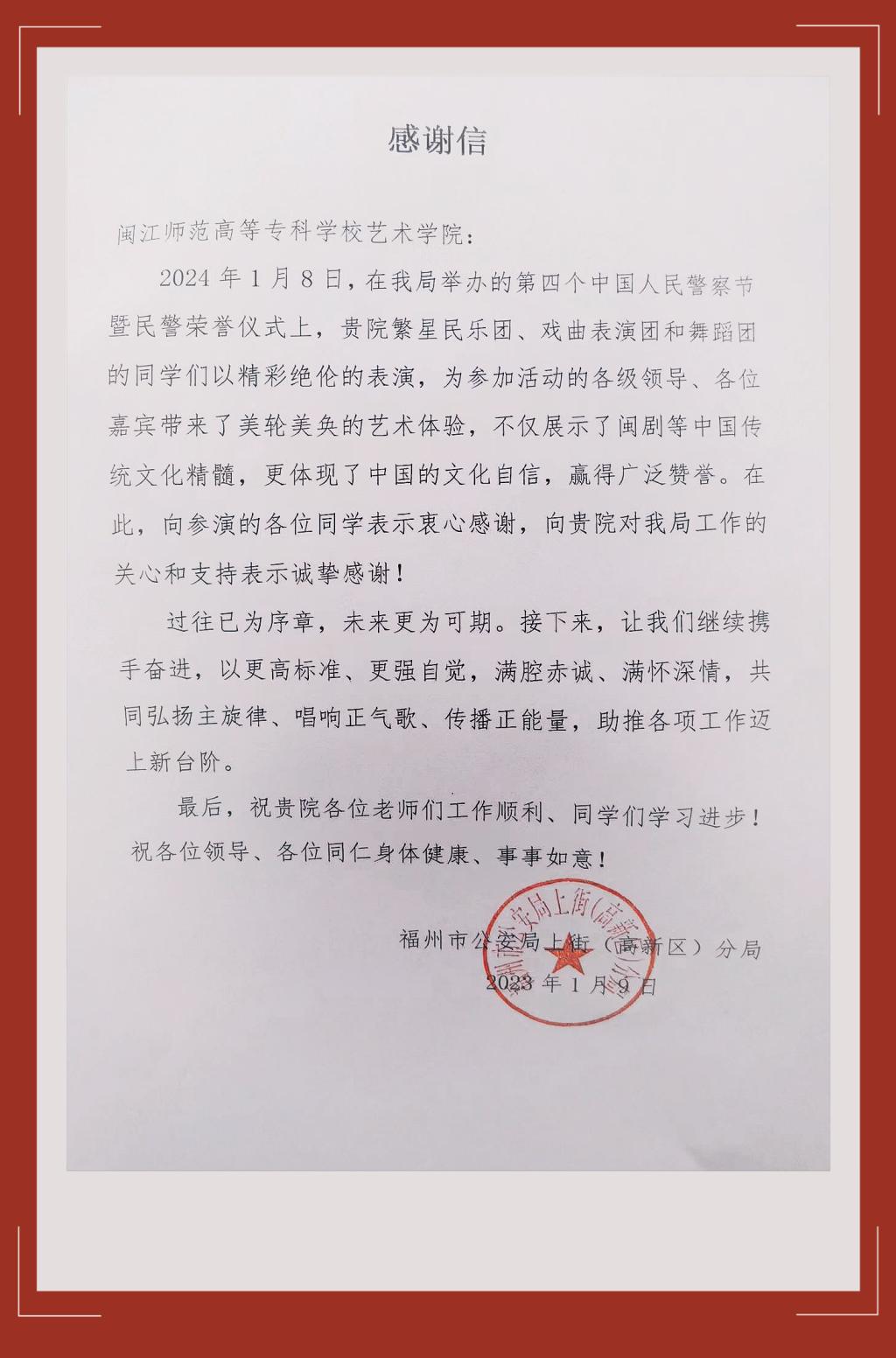 1月10日是中国人民警察节。为致敬一线人民警察的辛勤付出,进一步密切校、警联系,加强校、警联动协作,艺术学院师生受邀参加福州上街(高新区)公安分局庆祝第四个中国人民警察节暨民警荣誉仪式。