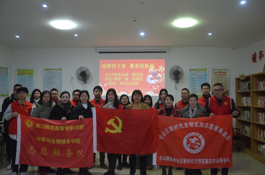 为丰富社区服务内涵,营造欢乐祥和的迎新春氛围,让居民在寒冬感受到关怀与温暖,1月25日,化学与生物技术学院党总支副书记张瑛、教师支部书记张文敏带领学生志愿者前往仓山镇联建社区参加“迎春饺子宴,墨香送祝福”“我们的节日·春节”主题活动。