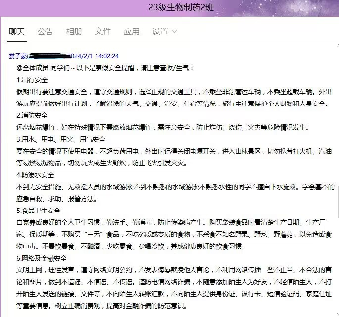 为做好春节寒假期间学生的安全教育,确保学生度过一个平安祥和的寒假,2月1日,化学与生物技术学院线上开展了寒假安全教育。