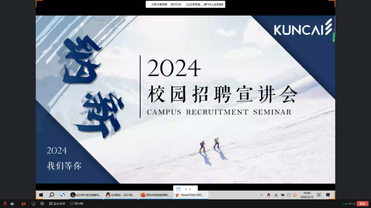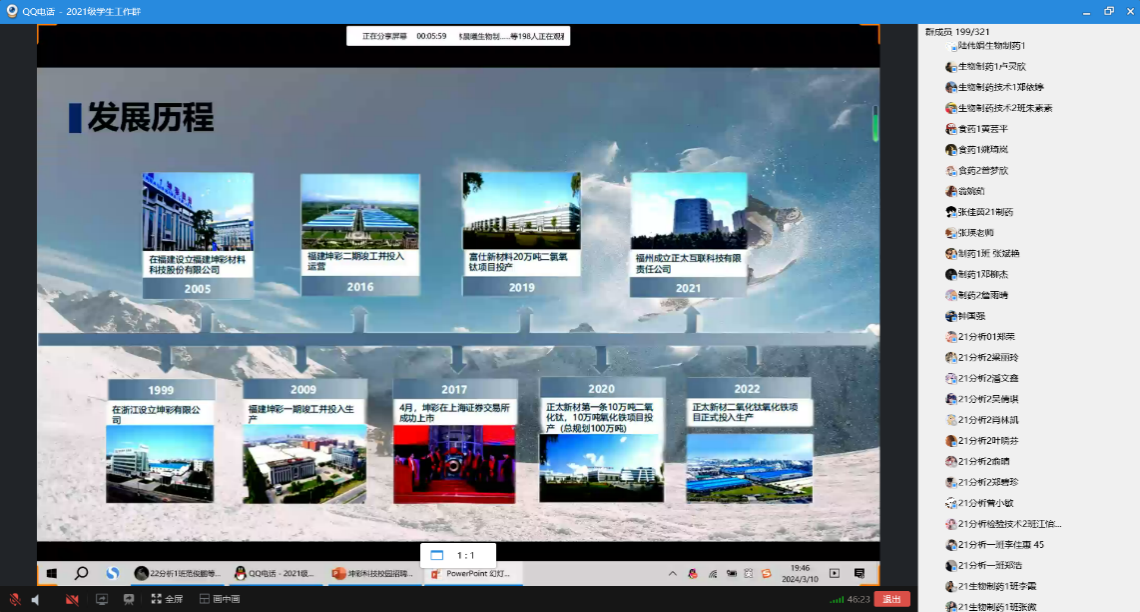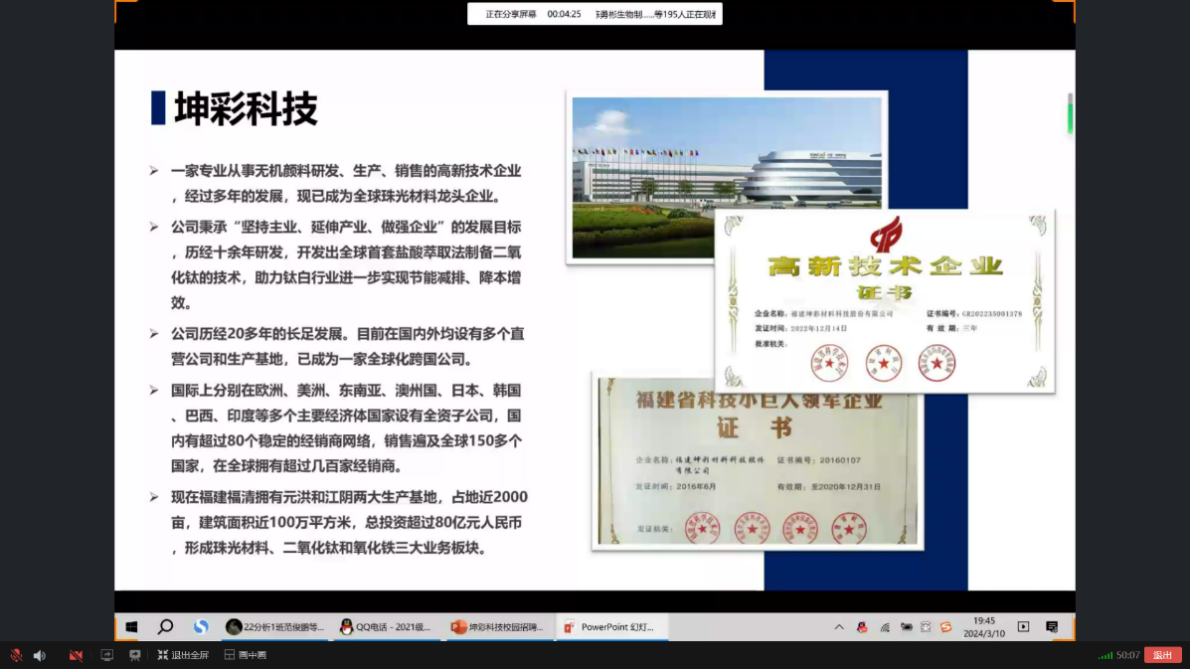 3月10日,化学与生物技术学院联合福建坤彩材料科技股份有限公司开展了线上宣讲会。会议由学院党总支副书记张瑛主持,2024届全体毕业生参加。