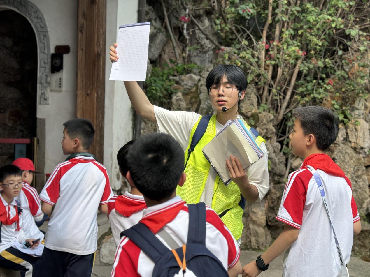 研学活动当日,艺术学院32名学生志愿者带领福州市钱塘文博小学400余名学生来到三坊七巷,走进水榭戏台,穿梭在小黄楼、畲族馆、台湾会馆、郭柏荫等古建筑中,找寻不同类型的纹样,了解纹样里的中国故事,探寻纹样里的两岸溯源。通过分组竞赛、答题闯关、设计纹样文创等活动,让钱塘文博小学的孩子们了解中华优秀传统文化,提升创新创造能力。