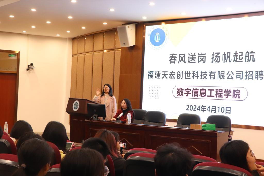 讲座结束后还进行了2024届毕业生招聘宣讲会,福建天宏创世科技有限公司企业代表从企业发展历程、未来发展趋势、经营业态、企业优势及特色等方面展开,详细介绍了本次招聘岗位、任职要求、人才职业发展方案以及福利待遇。在交流互动环节,同学们就企业环境、岗前培训等方面积极提问,企业代表耐心地为同学们解答,加深了学生对企业的了解,也为同学们提供了就业重要参考。