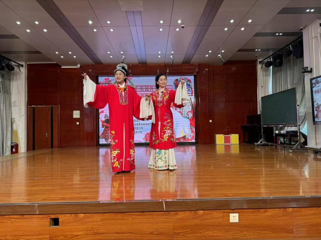 在开展的闽剧专场活动中,林梦萍为霞浦实小师生传授、普及闽戏小知识,学院师生表演了闽剧《荔枝换绛桃》《忆十八》,并与现场实小师生互动。在老师们的演示和指导下,短短几分钟的学习,实小师生举手投足间都有模有样,这神奇的戏台和戏曲的演绎在大家的心中播下了一颗亲近传统文化、传承这古老又美好的民间艺术的种子。