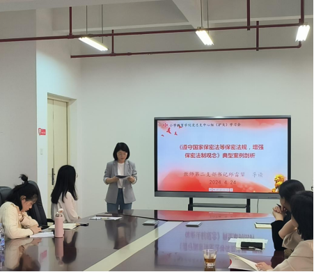 在学习过程中,党总支纪检委员邱雷顰同志带领大家认真研读新修订的《中华人民共和国保守国家秘密法》,强调全体教师要提高政治站位,牢固树立保密工作无小事的思想,抓好保密工作任务落实,坚决防止泄密事件发生。同时,她介绍了当前保密工作的严峻形势,传达了近期失泄密典型案例并重点解读了易发生的失泄密常见情形,警醒大家要以案为鉴,强化忧患意识和责任意识,守住保密底线,严防各类失泄密案事件发生。