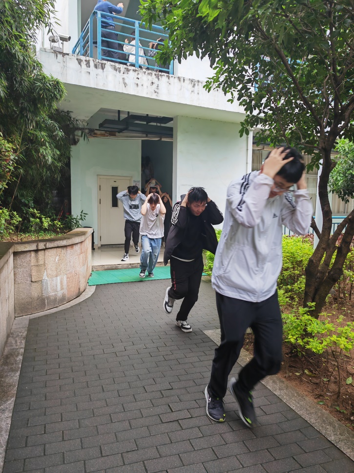 上午9时,“地震”警报的响起,师生快速行动,双手护头,蹲在课桌下或教室承重墙的角落;随着“疏散”警声响起,全体师生按照预定的疏散路线迅速、有序地撤离到户外安全地带,指挥人员及时巡查清点人数,做好防护工作。