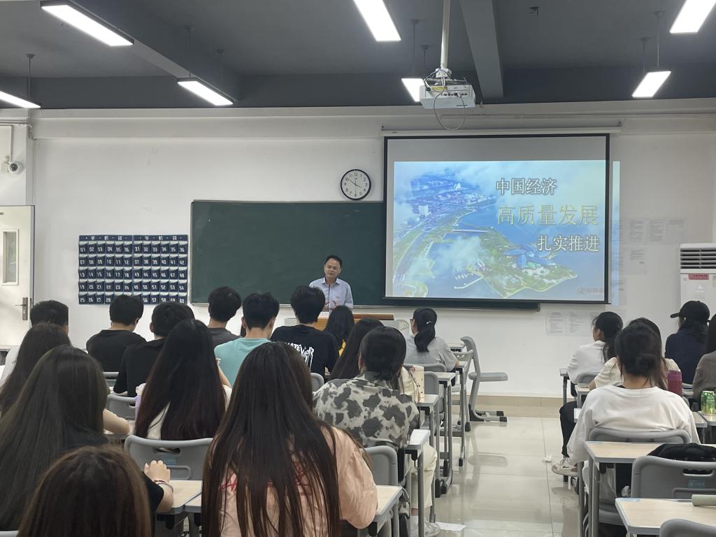 王华以“中国经济高质量发展扎实推进”为题,强调高质量发展是“质”与“量”的辩证统一,这一理念充分体现了中国经济发展的新阶段、新目标和新要求,对推动经济社会转型升级具有重要意义。他结合具体案例,生动展示了中国经济高质量发展的实践成果:从制造业的转型升级、服务业的快速发展,到创新驱动的战略实施,再到生态文明建设的全面推进,中国经济高质量发展的步伐日益坚定。他希望同学们要更加坚定对中国经济未来发展的信心,培育正确的价值观和人生观,努力学习、敢于创新、练就本领,为推进中国经济高质量发展贡献青春力量。