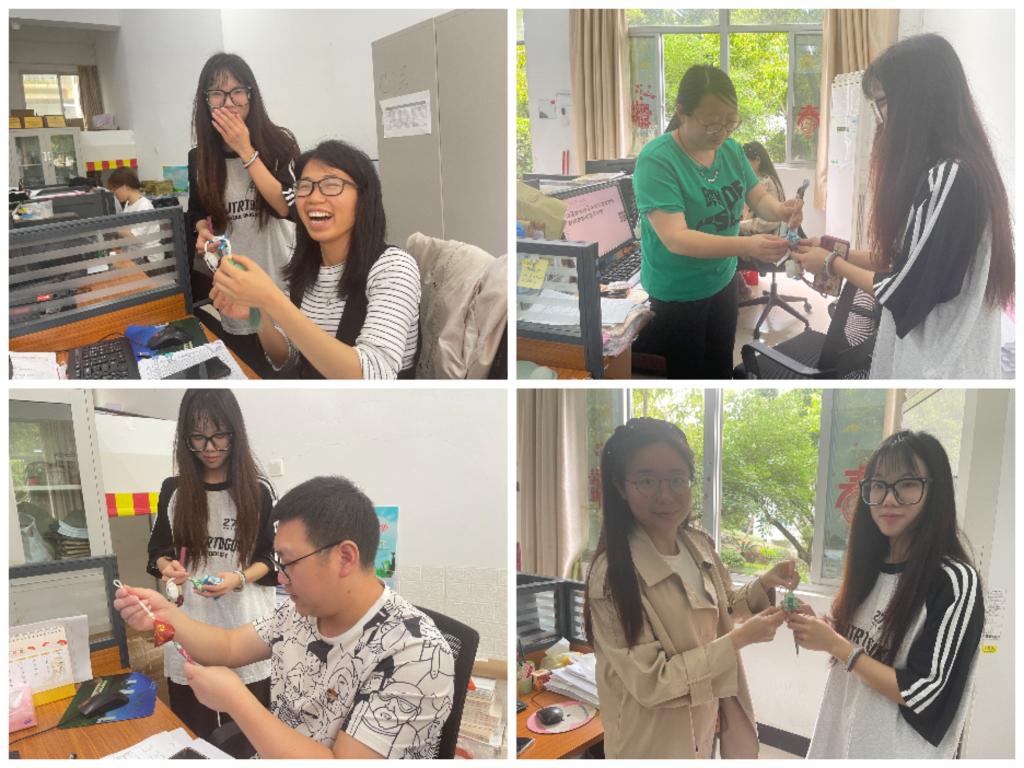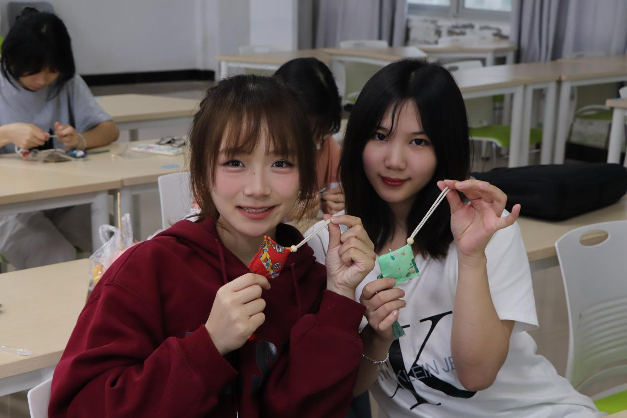 在轻松快乐的氛围中,一个个小巧精致的手工香囊和精美的五彩绳制作而成,同学们脸上洋溢着满满成就感和幸福感。活动结束后,同学们将自己亲手制作的端午礼物赠予给老师同学,传递真挚祝福。