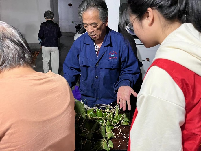 活动现场,同学们与社区居民们齐聚一堂,共同参与到包粽子的欢乐中。一片片清香的箬叶、一粒粒饱满的糯米、一根根五彩的丝线,在大家的手中翻转飞舞。经验丰富的居民们耐心地向大家传授着包粽子的技巧,从折叶到填米,再到绑线,一个个形态各异的粽子绽放指尖。大家围坐在一起,认真学习包粽子的方法,学生志愿者虽然动作略显生疏,但热情丝毫不减。他们一边包着粽子,一边交流着端午节的文化和习俗,欢声笑语回荡在社区之中。