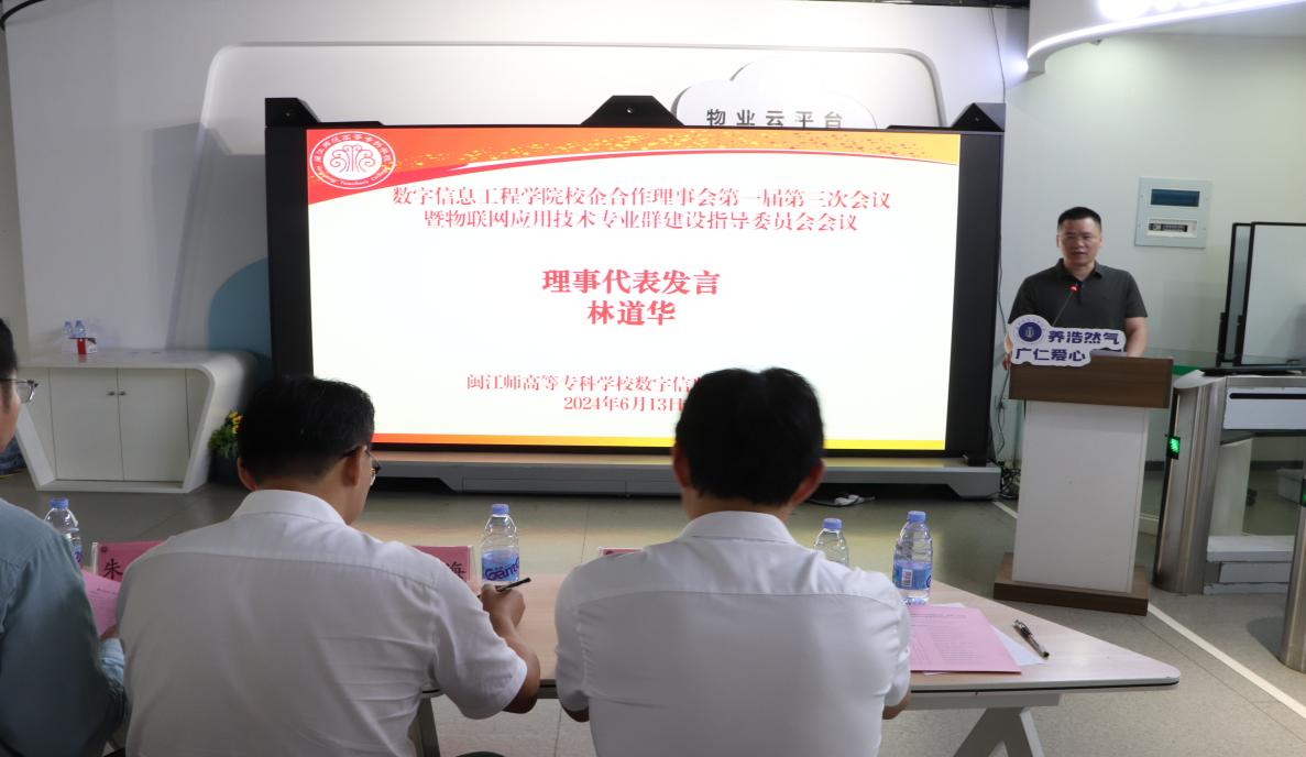 理事单位企业代表北京新大陆时代科技有限公司副总经理林道华发表了热情洋溢的讲话。他回顾了与学院的合作历程与取得的丰硕成果,并表示将进一步巩固合作成果,与学院一起努力继续深化合作。学院物联网技术教研室主任叶宁作专业群建设进展汇报,围绕专业群组群升级、建设情况和取得的成效作了汇报。