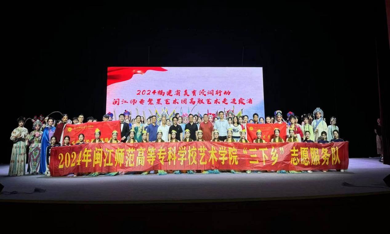 艺术学院繁星艺术团100余人深入霞浦九大馆艺术剧场开展文化振兴实践普及行动——高雅艺术走进霞浦县专场演出,为霞浦县300余名师生奉献了我院精心策划排演的大型情景歌舞剧《奔腾向海》。该剧为第八届福建艺术节优秀展演剧目、2023年度福建省文艺发展专项资金扶持项目、福州市打造闽都文化品牌项目,入选2024年教育部高校原创文化精品项目。该剧以“海上福州”发展战略为主线,以弘扬“海洋文化”“闽都文化”为主题,以情景表演唱、舞蹈、音诗画、时尚体育、闽剧小唱等多种艺术形式呈现,内容丰富、形式多样,为师生观众献上了一场精彩绝伦的视听盛宴,获得师生的一致好评。