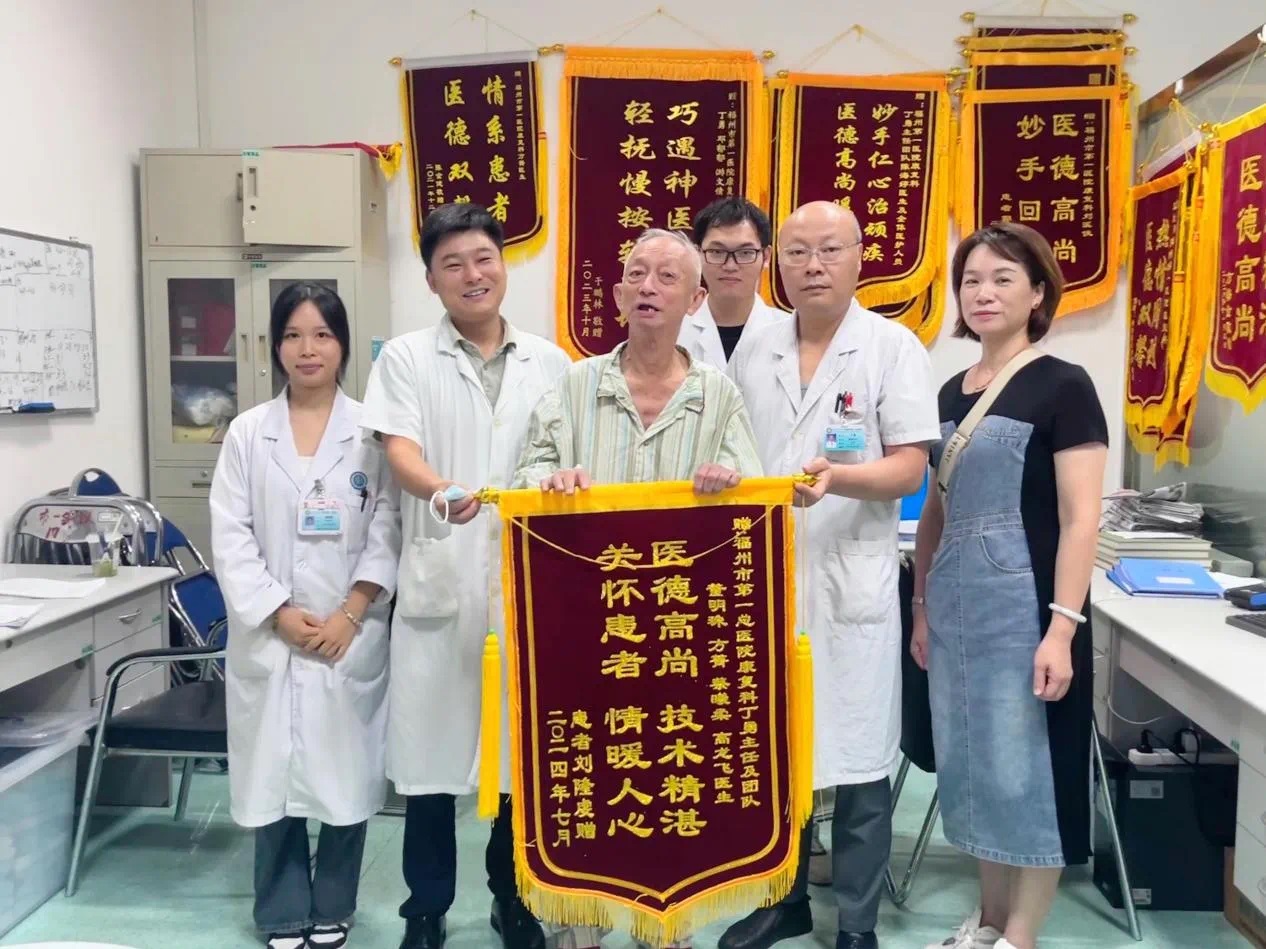 近日,医护学院22级康复治疗技术专业蔡曦柔、高龙飞两位同学,在福州市第一总医院的康复科实习期间,在丁勇主任及团队董明珠、方菁医师的指导下,对一位79岁高龄患者关怀备至、悉心照料,获得患者及家属的高度肯定,患者特制作锦旗致谢。
