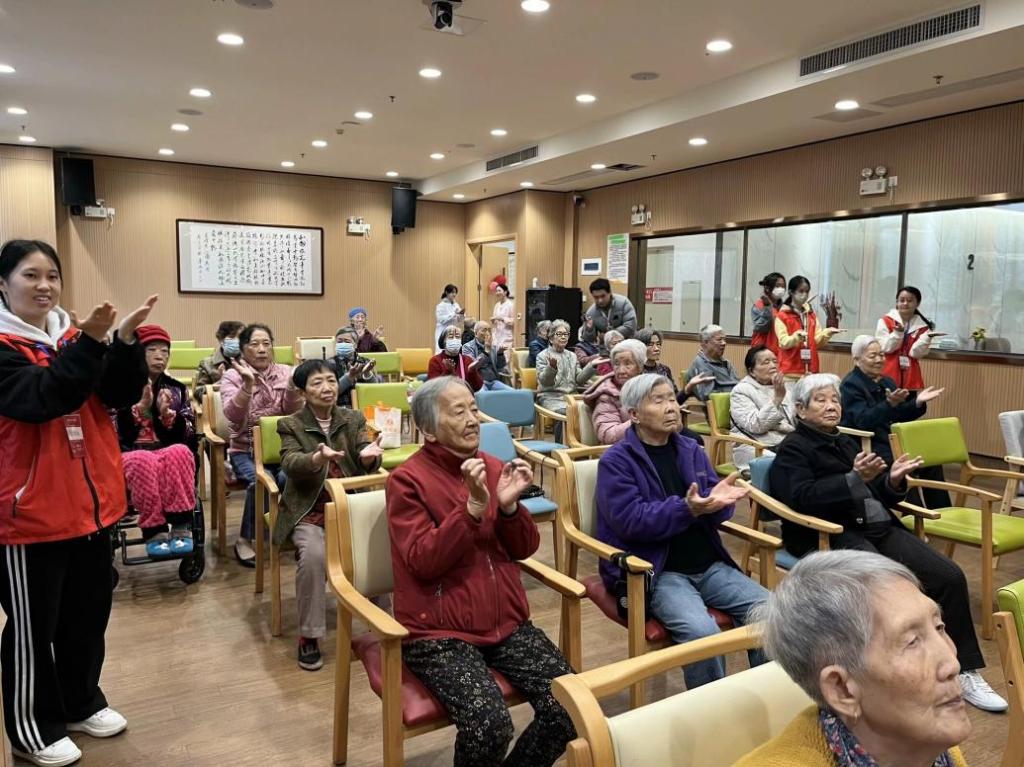 活动在颐养中心的多功能厅展开,领舞者在舞台上示范,其余志愿者们围绕在老人们身旁引导学练手势舞。志愿者们细致地展示每个动作,耐心讲解每一步骤,确保每位老人都能跟上节拍。随着音乐的流淌,老人们舞动手指,现场洋溢着温馨活跃的氛围,老人们在锻炼中寻得了乐趣,志愿者们也在奉献中体会到了满足,彼此间建立了温暖的连接。