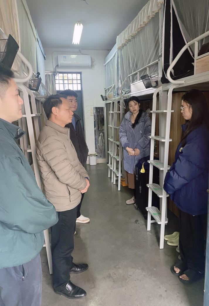 走访过程中,学院领导、老师们与同学们亲切交谈,详细询问了学生的学习、生活情况,叮嘱同学们要尽快调整状态,养成良好的作息规律,保持积极向上的精神状态,以更加饱满的热情投入到新学期学习中去。同时,老师们还强调了宿舍文明的重要性,希望同学们共同维护干净整洁的宿舍环境,营造文明温馨的生活氛围。