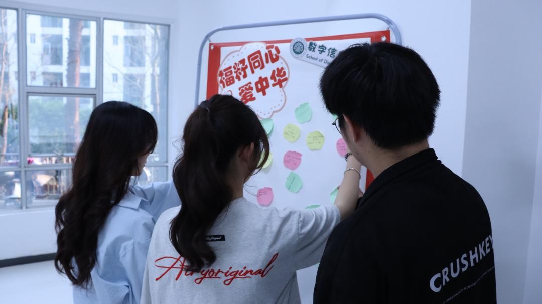 本次座谈会伊始,团委指导老师李晶晶给全体师生开展了“福籽同心爱中华”民族团结主题教育,向同学们展示了少数民族的生活、传统体育项目,讲解了民族团结的内涵、意义,并叮嘱同学们要通过加强民族认同、尊重并参与民族交流、投身民族事务等方式积极参与到维护民族团结的实践中。少数民族同学们用自己民族的语言在纸上写下了“我爱你,中国”,并贴在心愿墙上。