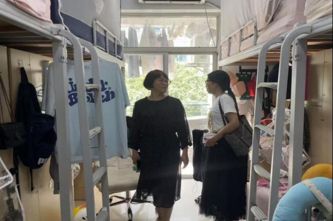 在走访过程中,郭晓莹与同学们进行了亲切交流,详细询问了大家近期的学习安排、生活状况及假期规划,并耐心聆听了同学们对学院管理、服务保障等方面的意见和建议。她提醒同学们,要始终保持高度的安全意识,严禁在宿舍使用违规电器,离开宿舍时务必切断电源,切实防范火灾事故的发生;同时,要妥善保管个人贵重物品,增强防盗和网络防骗意识。辅导员老师们仔细检查了学生宿舍的卫生状况、用电安全以及公共设施的情况,并针对发现的部分安全隐患和卫生死角,当场提出了具体的整改意见。