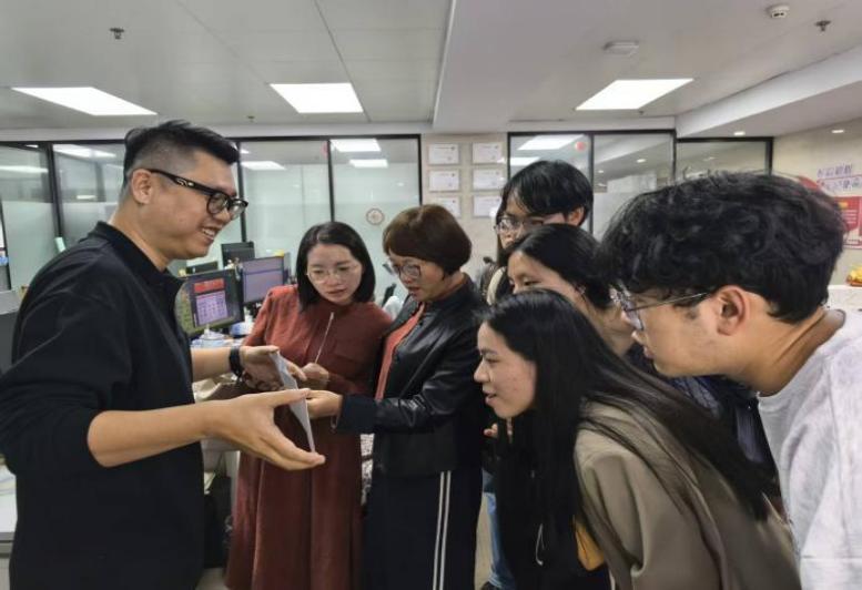 在企业负责人黄晖的陪同下,学院师生参观了企业的办公环境、特色产品展示区以及生产设计工作室,深入了解了企业的业务布局和业绩成果。郭晓莹对企业的热情接待表示感谢,她介绍了学院的教学特色以及数媒专业的课程设置、实践教学安排和人才培养目标。与此同时,企业代表也分享了当前市场对数字媒体技术人才的具体需求方向,包括行业发展趋势、技能要求以及未来人才缺口等方面的信息。双方就如何更好地对接教育培养与市场需求进行了充分的沟通,共同探讨了提升人才培养质量的有效途径。