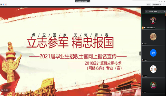 为做好2021年征兵及士官报名宣传工作,推进大学生应征入伍工作,帮助大学生了解、掌握直招士官相关政策和流程,充分激发大学生报名参军的热情,献身国防事业。4月5日至15日期间,计算机系分专业开展了多场线上宣讲会。